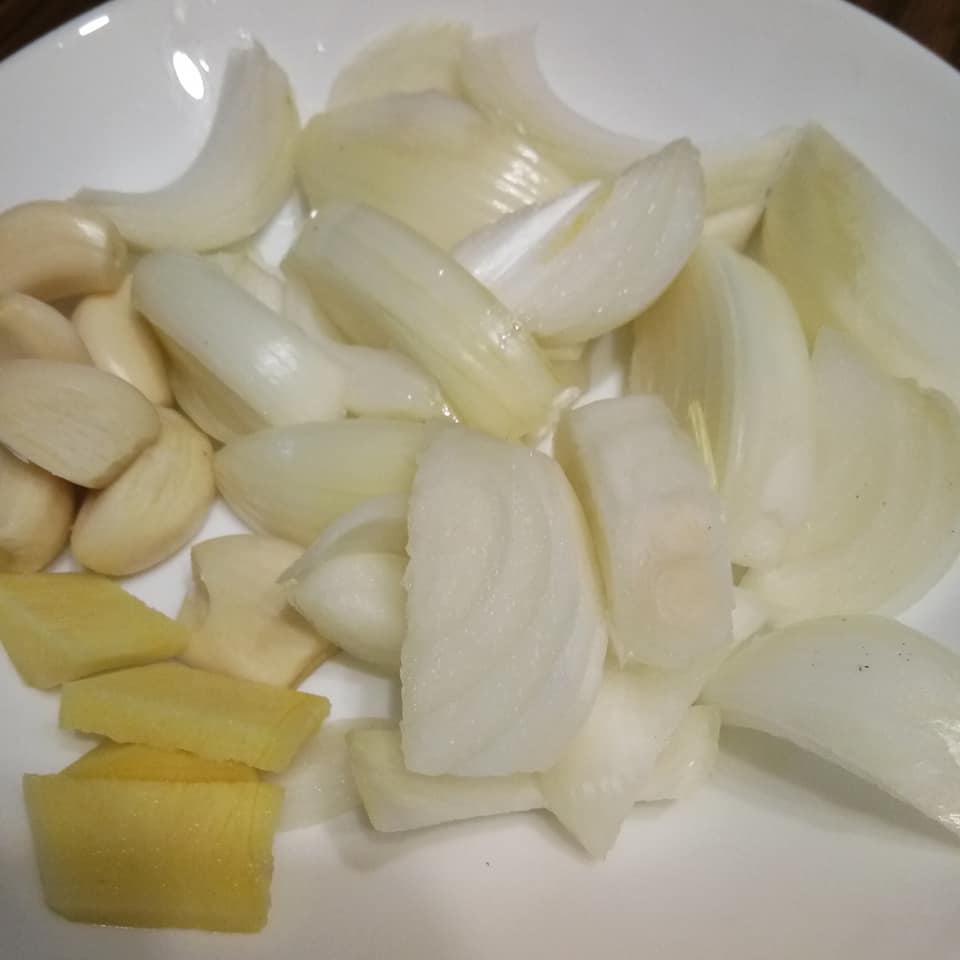5. Bahan kisar iaitu bawang holland, bawang putih, halia, buah pear. Tak payah campur air. Blend kering.