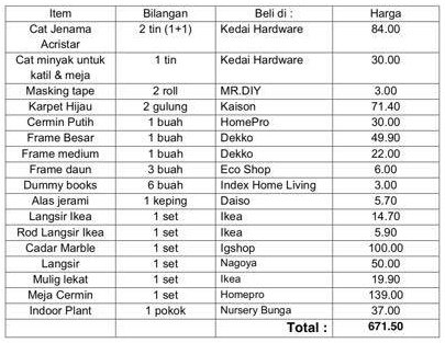 Inilah bajet penuhnya. Pricey juga pada saya sebab saya tukar cat, beli cadar dan langsir baru. Kalau encik/cik nak guna apa yang dah ada, mesti jauh lebih murah. Selamat mencuba!