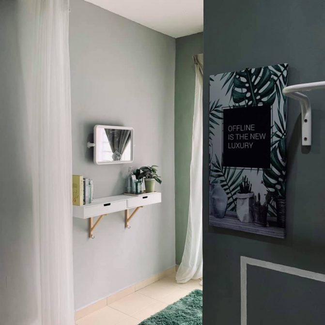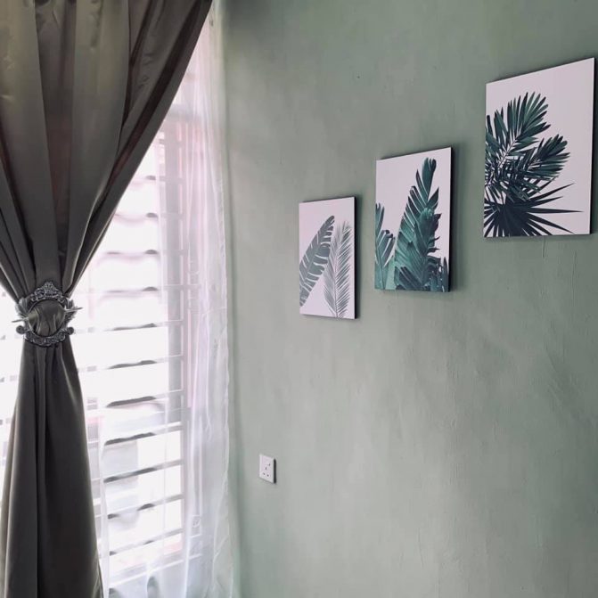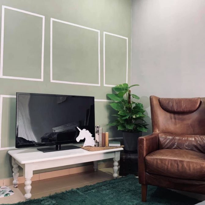 Tadaaa… Ini lah keadaan bilik selepas. Siap ada ruang menonton sendiri. Saya tambah corak wainscoting guna masking tape saja sebab tak mampu nak upah orang buat hihi, mahal kan tapi teringin jugak nak ikut trend. Kod cat Silver Grey dan Owen jenama Acristar. Satu tong ada 7 liter. Dua tong saja saya guna untuk cat bilik ni.