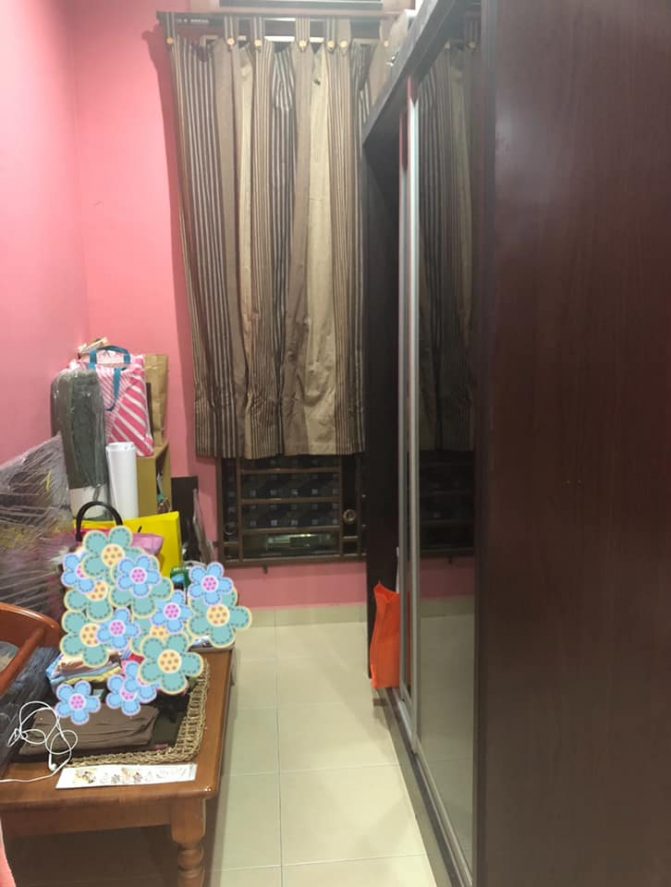 Inilah bilik asal saya di rumah ibu. Dah 10 tahun warna bilik ni merah menyala dan pink pekat huhu. Bilik ni besar dan kami kongsi tidur bila adik beradik balik sebab tu letak dua katil queen. Memang hanya bilik tidur semata.