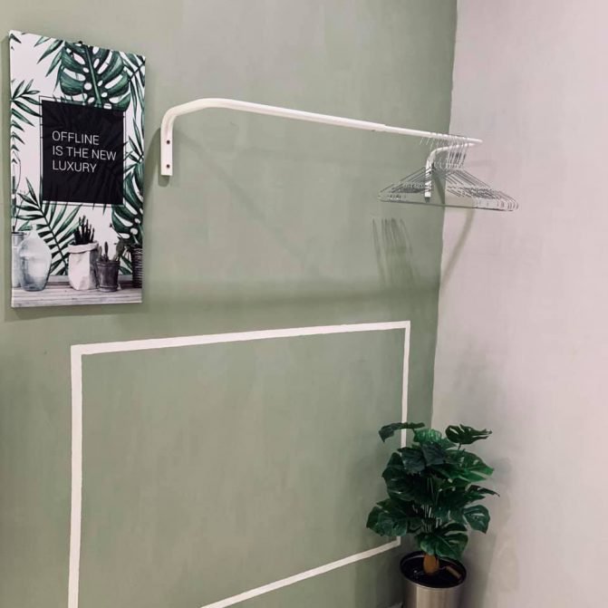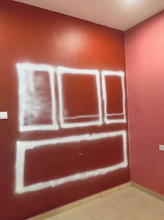 Saya malas nak beli cat putih jadi saya spray je untuk buat wainscoting. Bila spray dah kering, saya tampal masking tape ikut cara yang pernah viral dulu, kredit tu Shafeq Bada atas perkongsian beliau.